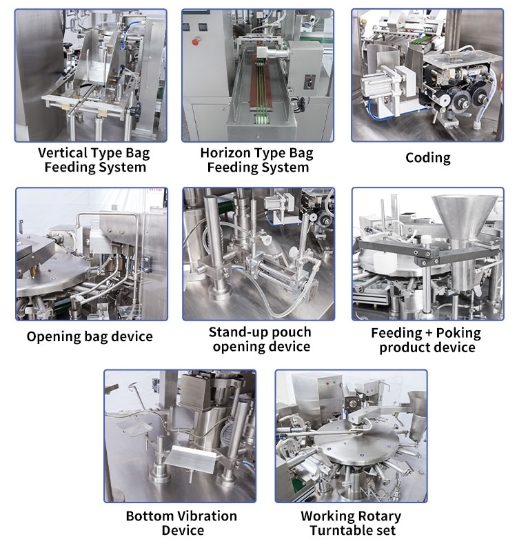 | Arbeitsablauf | Giving bag→Coding→Opening bag ((oder Open zipper bag)→Füllung→Hilfsmittel→Auspuff→Wärmedurchdichtung→Formen und Ausgabe von Produkten. | ||
